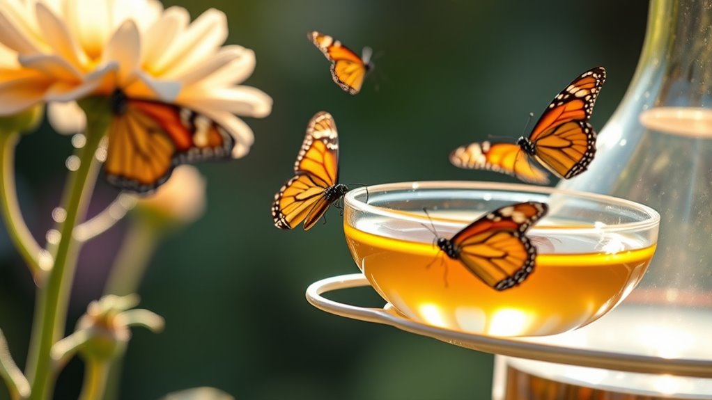 Keep in mind, scent and warmth matter too, so offer a shallow dish in sunlit spots. Mix sugars 1:4 with water, refresh every few days, and rotate colors to maintain interest.