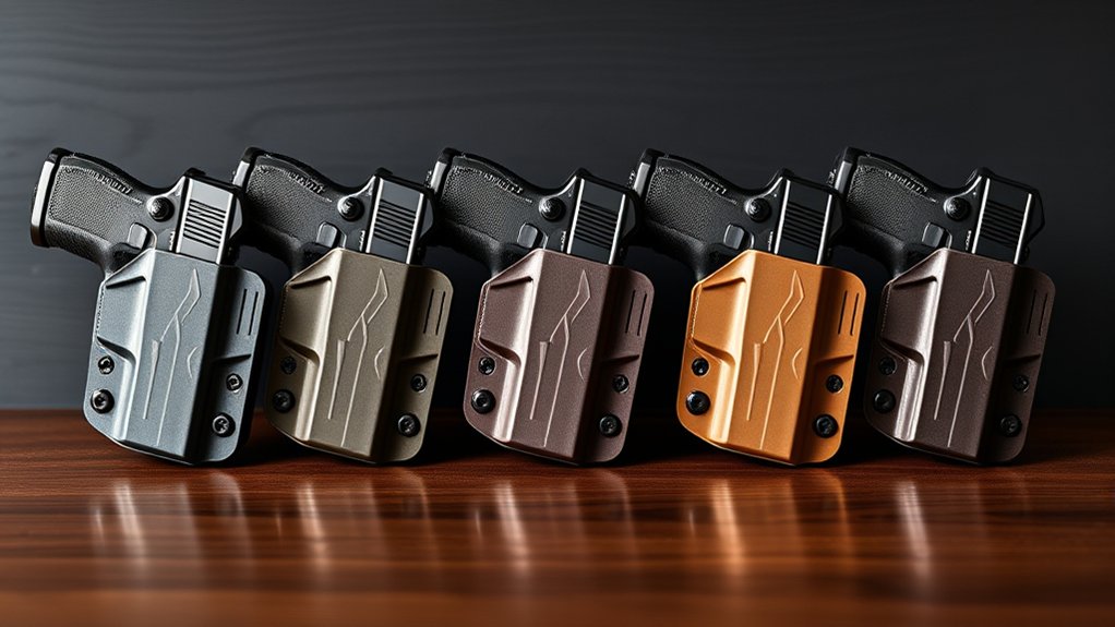 You’ll want holsters made from Kydex or injection-molded polymer for extreme weather since they resist moisture, heat, and cold without warping. Leather can soak up water and lose shape, so it’s less reliable in harsh conditions. Nylon’s lightweight but might not hold up well to heavy rain or freezing temps.