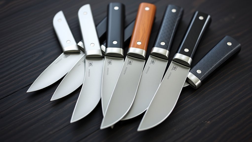 Coincidentally, these materials not only resist moisture and wear but also provide excellent grip, which is essential when precision matters most. You’ll appreciate how these handles let you maintain control during delicate skinning tasks, even in wet or slippery conditions, ensuring your knife performs reliably every time.