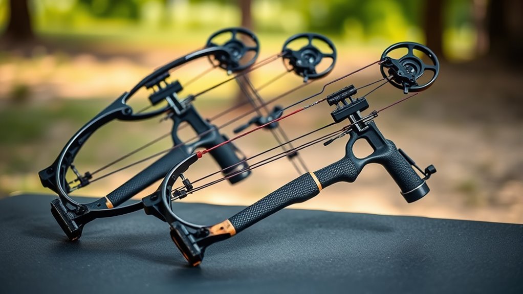 Both bows provide smooth draws, durability, and easy maintenance, though hand orientation and adjustment range vary. If you want to fine-tune your choice based on fit, weight, and features, there’s more to explore.