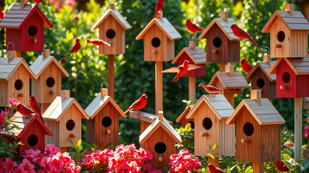 Consider the material too—resin offers durability and vivid colors, while natural wood blends seamlessly with outdoor surroundings. Unique design elements like see-through windows or multi-hole structures not only boost visual interest but also serve practical purposes. Selecting color schemes and shapes that resemble natural habitats helps your birdhouse harmonize with the environment, making it more inviting for cardinals.