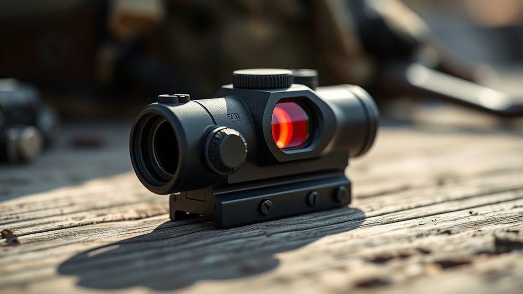 A sealed design protects the internal electronics from dust, debris, and moisture, extending its lifespan. You’ll want shockproof capabilities rated to withstand impacts of 2000G or more, ensuring it survives recoil and accidental drops.