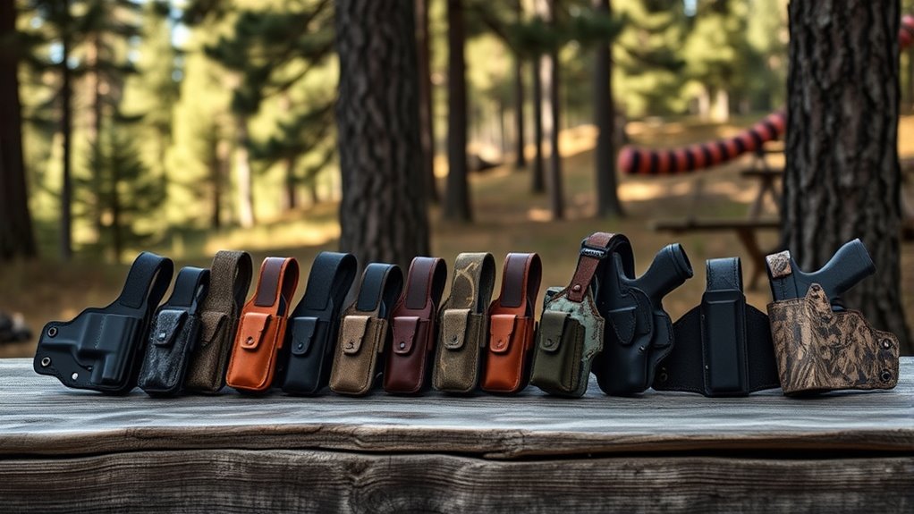 Adjustable straps are key—they let you customize the fit to prevent shifting and allow quick drawing when needed. Also, consider anti-theft features to stop unauthorized access, especially in crowded or risky spots. Choosing a holster with these qualities guarantees your firearm stays safe, accessible, and concealed, giving you the confidence to focus on the hunt.