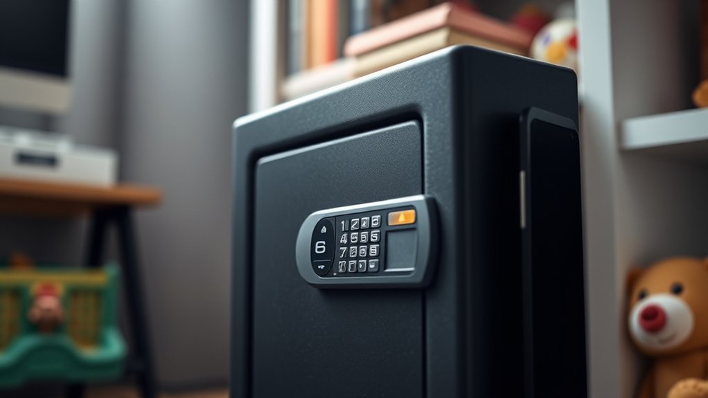 Furthermore, consider safes with internal soft linings or foam padding to reduce injury risks from accidental bumps or falls. Ensuring the safe complies with safety standards like ATF or CPSC guidelines guarantees it meets recognized childproof security criteria.