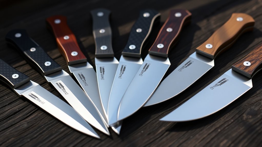 Finally, consider blade shape: tanto blades excel at piercing, while drop point blades perform better for slicing tasks. Matching your knife to its purpose guarantees peak performance and satisfaction.