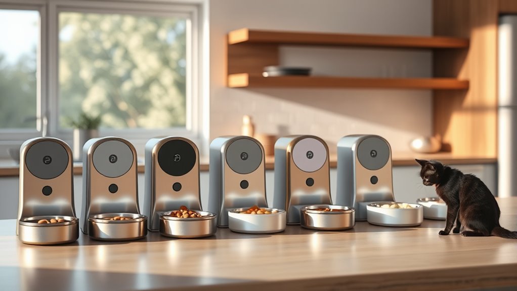 A solid freshness system directly impacts shelf life and quality, helping kibble stay fresh and nutritious over extended periods. Prioritize these features when evaluating feeders to guarantee consistent meal quality for your cat.