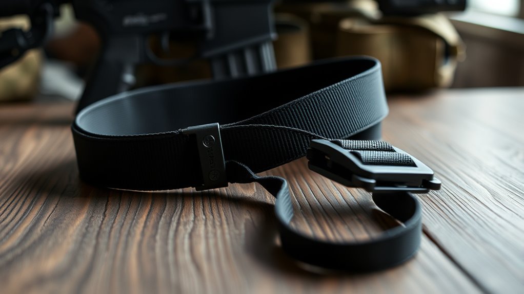 Padding materials like EVA foam or closed-cell foam provide comfort without sacrificing resilience against wear and tear. Additionally, stitching quality, especially double or reinforced stitches, is vital for handling repeated stress. Using tear-resistant and abrasion-resistant fabrics guarantees that your sling maintains its performance and integrity, even in the most demanding tactical situations.