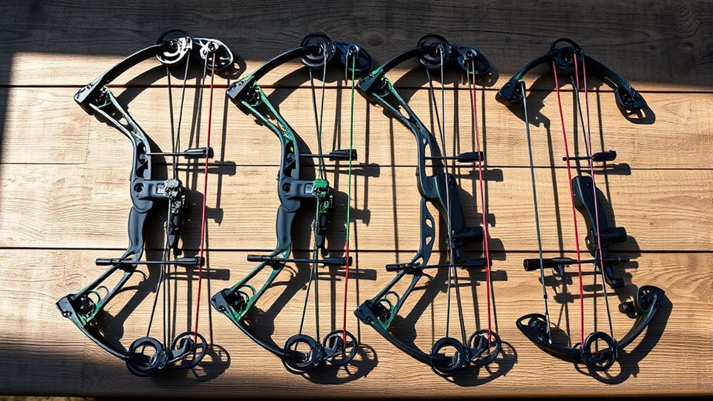Next, check draw length adjustments, typically between 25 to 31 inches, so the bow matches your arm length precisely. You’ll also want a bow with cams and limbs that can be finely tuned for ideal performance and comfort.