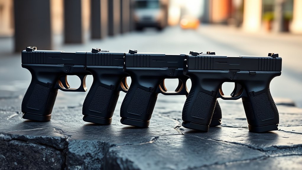 The grip design, including contours and texture, also plays a role in how well the firearm hides against your body. A low-profile slide with minimal protrusions enhances concealment across various carry positions. Ultimately, selecting a Glock with a smaller footprint and slim profile guarantees it stays hidden, offering you a more comfortable and confident concealed carry experience.