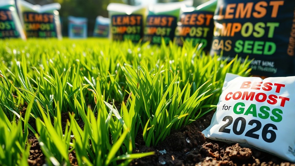Choosing compost with organic materials, proper nutrients, and easy application guarantees a thriving lawn. Keep exploring to discover which best suits your needs.