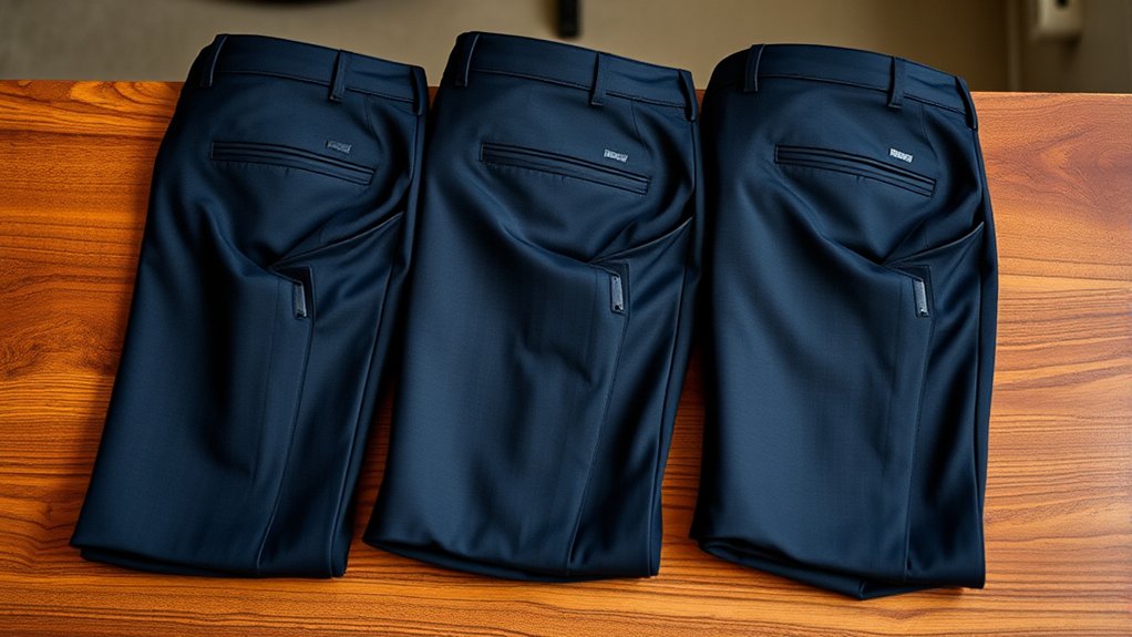 Look for pants with reinforced stitching and stress points to boost their lifespan, especially if you face demanding environments. Water-resistant coatings protect your pants from moisture and stains, keeping them looking sharp no matter the weather. Finally, lightweight yet sturdy fabrics ensure you stay comfortable all day without compromising durability or concealment.