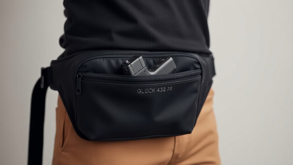 Choosing a concealed carry fanny pack for your Glock 43X requires careful attention to fit and comfort to guarantee all-day wearability. Look for a pack with an adjustable strap that can fit waist sizes up to at least 55 inches, ensuring a customizable, secure fit. Prioritize padded back panels and breathable materials like neoprene or mesh to enhance comfort during extended use.