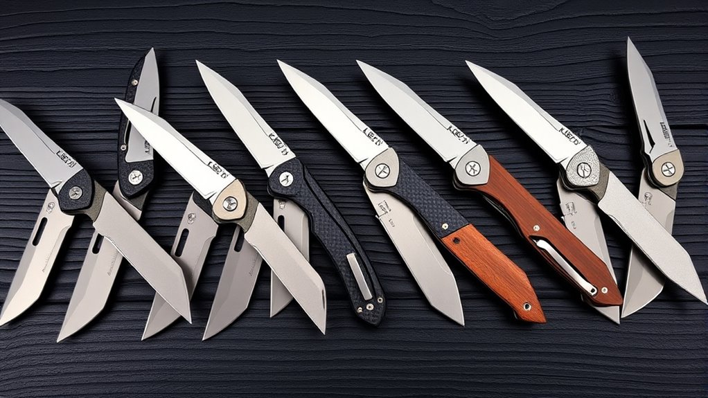Choosing the right blade material is essential for a concealed carry folding knife, as it directly affects performance and durability. You’ll want materials like stainless steel, D2, or 440C, which offer excellent corrosion resistance and keep their edge longer. Pay attention to the hardness rating (HRC), since higher hardness usually means better edge retention and durability.