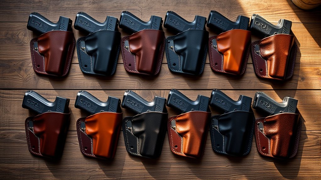 You’ll want concealed carry leather holsters made from premium full-grain or cowhide leather for durability and comfort that molds to your body.