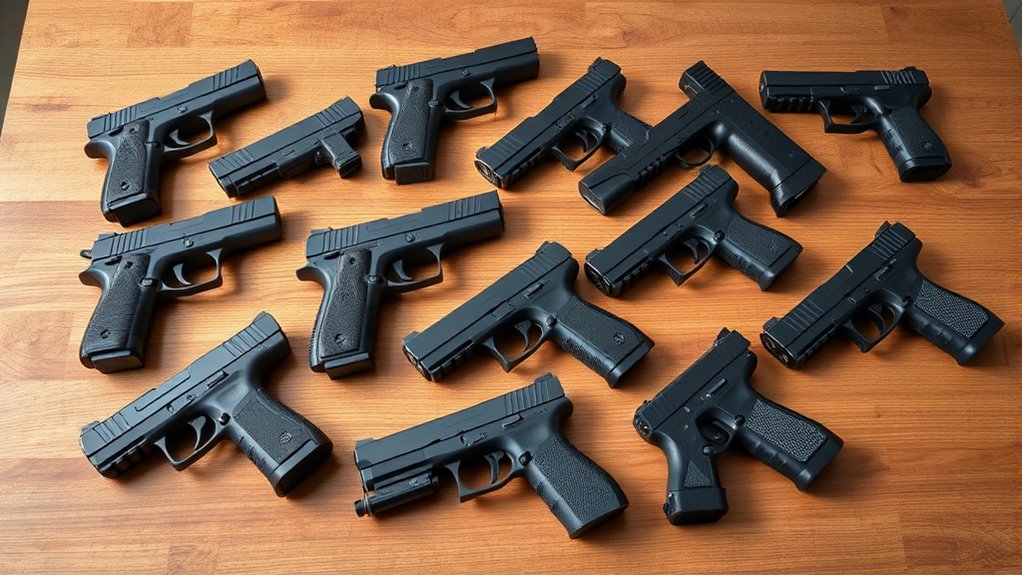 Adjustable backstraps are a big plus, letting you customize the grip to fit your hand perfectly. Before buying, spend time dry firing or handling pistols with wider frames to see how they feel. Testing different widths helps you avoid discomfort and guarantees secure handling, making your concealed carry experience safer and more effective.