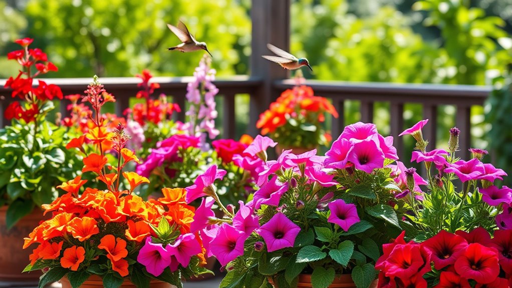 Since hummingbirds rely heavily on visual cues, choosing brightly colored flowers is key to attracting them to your containers. They’re especially drawn to reds, oranges, and pinks because these colors mimic their natural nectar sources. Red flowers work wonders since hummingbirds see this color most clearly and associate it with food.