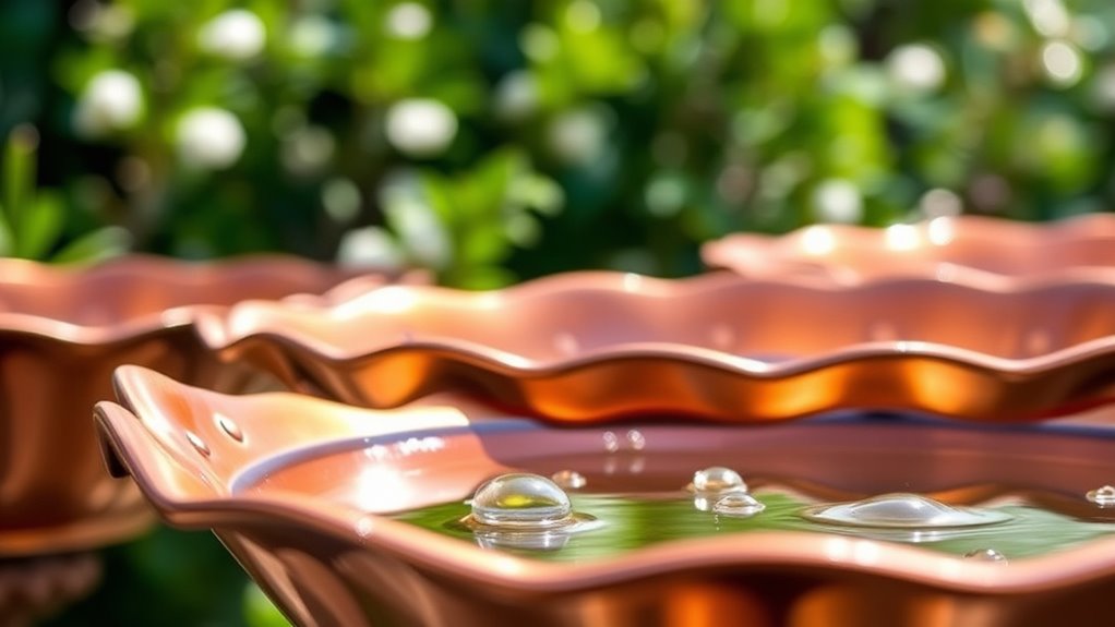 Maintenance and longevity matter because well-kept copper baths last longer and stay cleaner for the birds. You’ll want a bath with thick gauge copper—around 22-gauge—for durability against outdoor wear. A natural patina forms over time, helping protect against corrosion and extending life, so don’t rush removal.