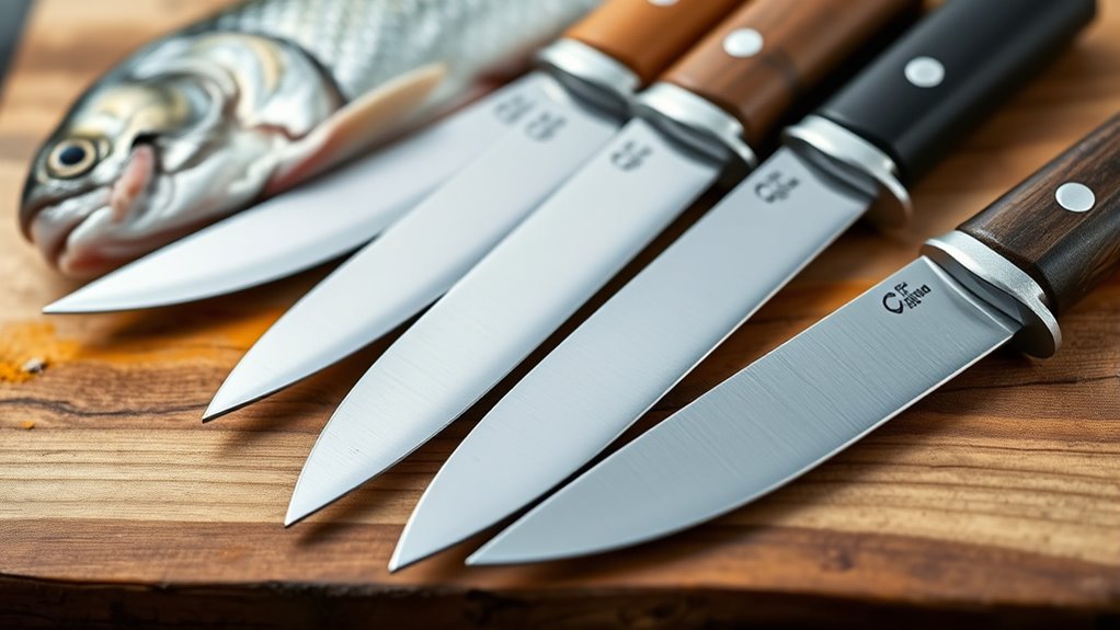 You’ll want a fillet knife with a sharp, flexible blade made from high-quality German or high-carbon stainless steel for precise crappie cleaning. The KastKing Speed Demon Pro and HOSHANHO 7” knives offer excellent durability, corrosion resistance, and ergonomic, non-slip handles, perfect for tackling both freshwater and saltwater conditions.