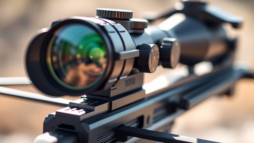 Selecting a crossbow scope that fits your setup requires paying close attention to mounting compatibility. You need to verify the scope has compatible rings or bases, like 20mm Picatinny or Weaver mounts, that fit your crossbow’s rail system. Confirm that the scope’s tube diameter matches the mounting hardware requirements for a secure, stable attachment.