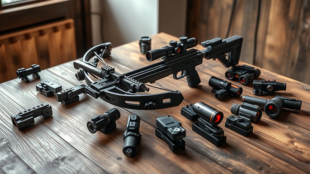 When choosing crossbow sights, you’ll want to focus on reticle types and designs that suit your shooting style. Consider magnification and field of view to improve accuracy, along with durability and weather resistance for reliable use.