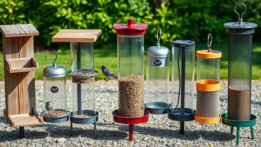 You’ve got options that cover trees, ground, and outdoor setups, so you can tailor feeding to your yard’s rhythm. Pick stainless steel for durability, or a tray feeder for easy access. Remember, consistency matters—regular meals keep birds returning and avoid wasted seed.