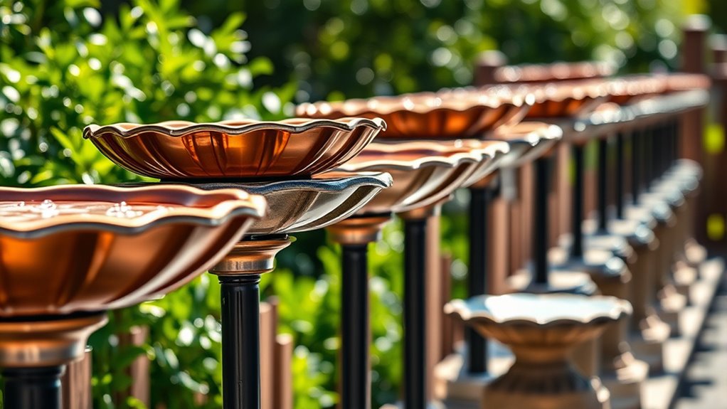 Durability matters as much as capacity when you’re choosing a deck-mount bird bath. You’ll want materials that endure outdoor elements, like stainless steel, cast iron, and weather-resistant plastics, so the bath lasts year after year.