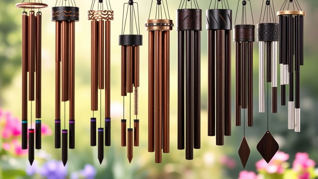 Consider the size and length of the tubes, too—larger, longer tubes create a more substantial and refined look. The color and finish, such as black powder coating or antique copper, help your chimes blend seamlessly with your outdoor decor. Artistic touches like adjustable components or custom tuning not only improve sound but also elevate the visual harmony, making your wind chimes a standout decorative element you’ll love.