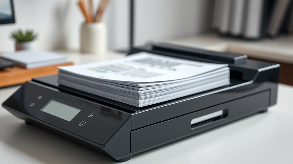 When choosing a document scanner with a feeder, prioritize OCR capabilities that turn scans into searchable and editable text. Make sure the scanner supports OCR to convert images into searchable files, boosting your workflow efficiency. Verify the OCR software is compatible with your operating system, whether Windows or Mac, for seamless integration.