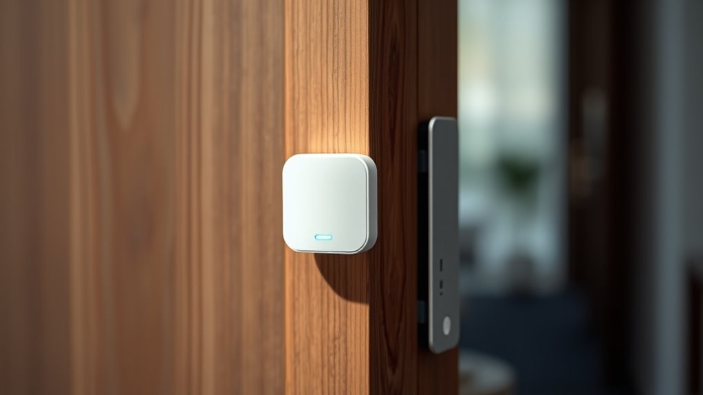 Wireless range coverage plays a crucial role in how effectively your door chime sensor detects openings from a distance. Typically, sensors offer wireless ranges between 300 and 1,000 feet, giving you the flexibility to place them throughout large properties or multiple rooms without losing signal.
