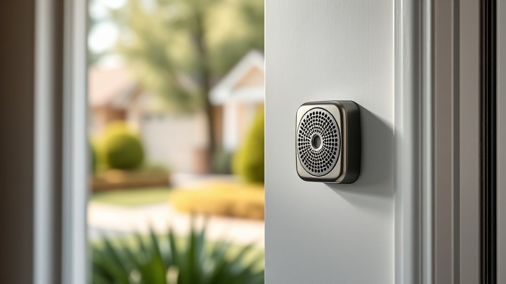 Look for chimes with customizable sound profiles, allowing you to select tones and adjust volume to match your environment and preferences. Features like night mode or silent mode help reduce disturbances by muting or lowering volume at specific times. Additionally, noise cancellation enhances two-way communication clarity, making sure you hear visitors clearly every time your doorbell rings.