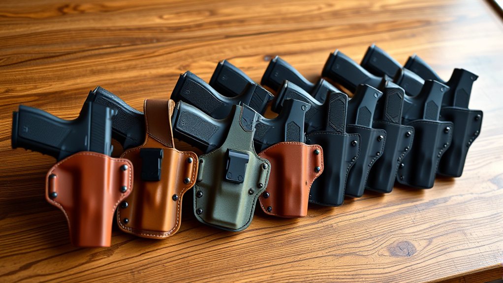 Look for reinforced stitching and sturdy attachment points; they guarantee your holster lasts through rigorous daily use. The material choice also affects weight. Select lightweight options that don’t compromise strength to avoid unnecessary fatigue.