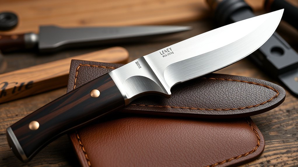 Additionally, textured or patterned handles enhance grip, making your cleaver safer and more comfortable to use daily. Prioritize materials that balance durability with comfort for the best EDC experience.