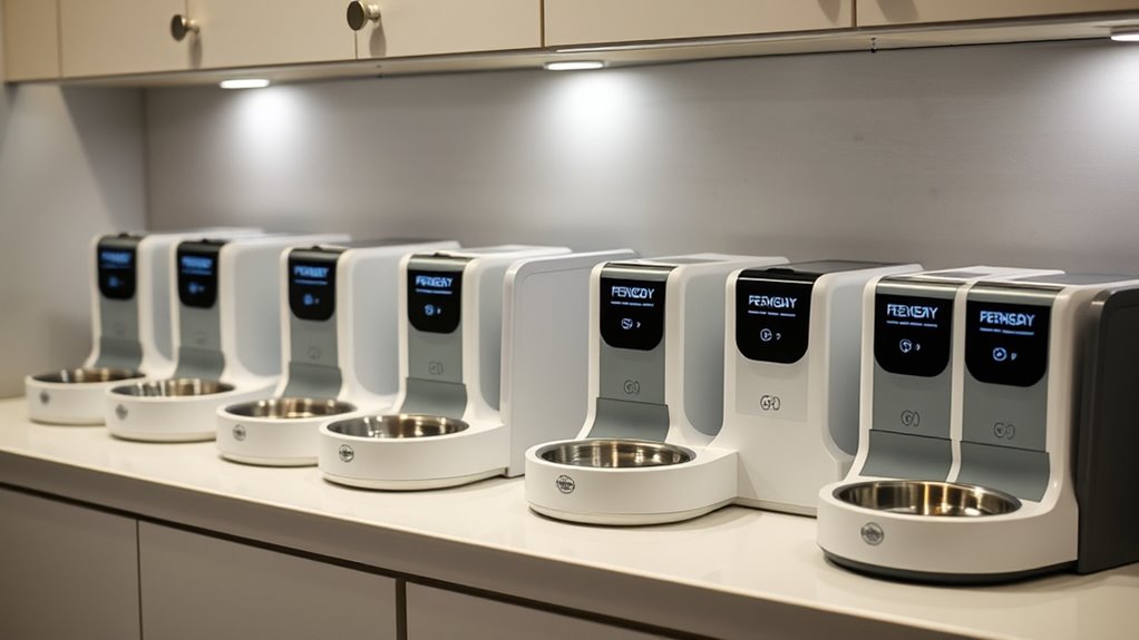 A larger capacity is ideal if you’re away for extended periods, ensuring your pet won’t run out during trips or weekends. The number of meals per day varies by model, with some dispensers offering up to 6-10 portions to fit your schedule. Choose a feeder with adjustable portions to prevent overfeeding or underfeeding, supporting healthier eating habits.