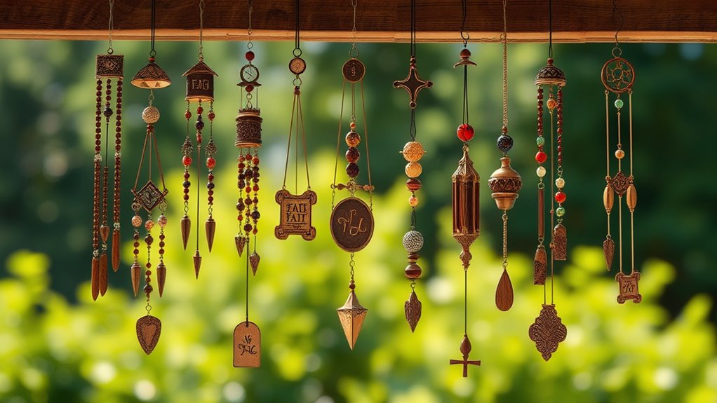 If you want a rich, soothing tone, go for aluminum or titanium chimes. They’re durable, weather-resistant, and deliver consistent, harmonious sounds that’ll enhance your spiritual space beautifully.