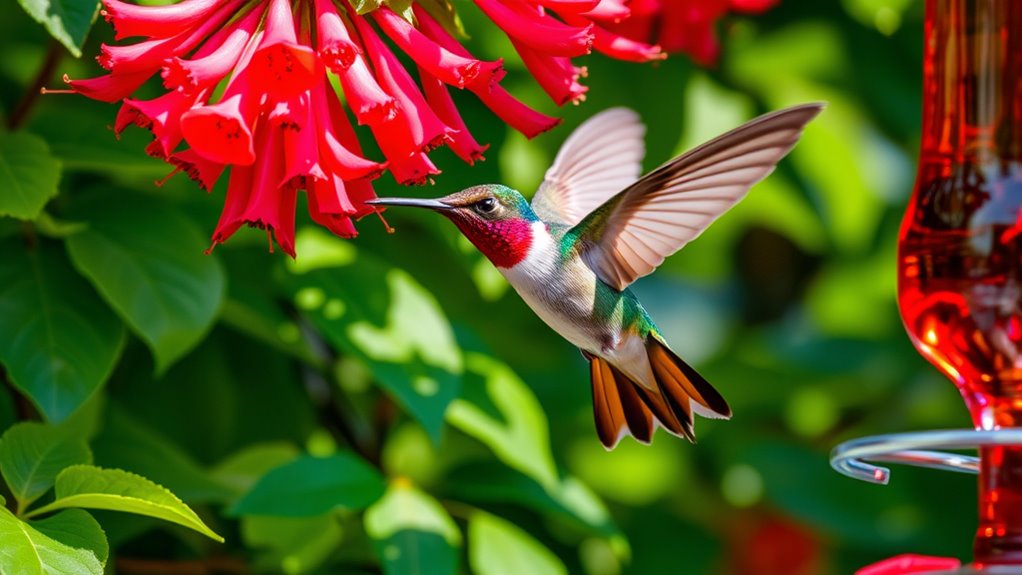 On warm, sunny days, they buzz around more actively, seeking nectar to fuel their nonstop wings. So, if you want to attract them, consider how weather swings influence their visits and adjust feeding times accordingly.