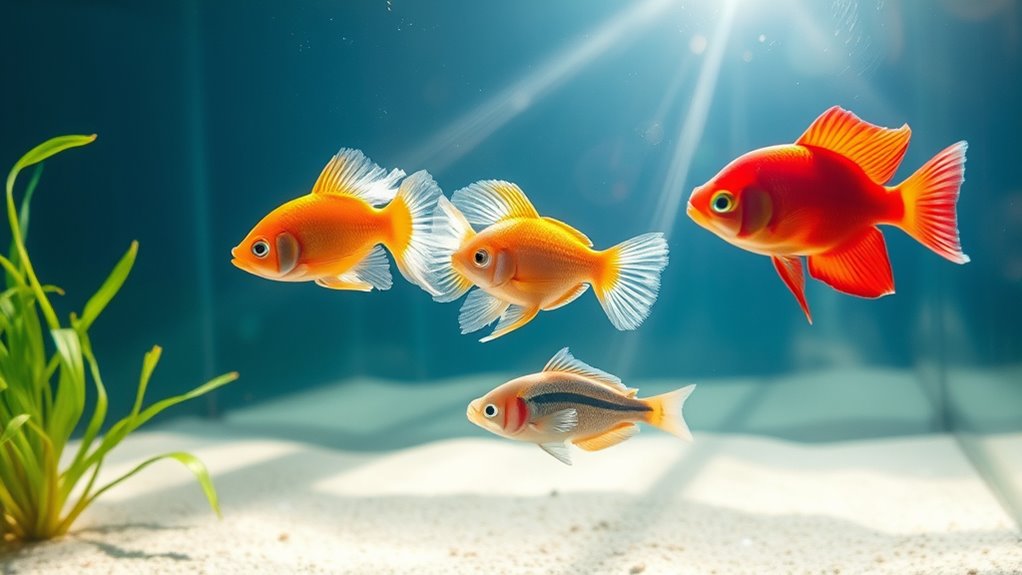 Size compatibility is essential to prevent injuries and guarantee natural feeding behavior. You’ll pick feeder fish size that matches your tank inhabitants to avoid accidental ingestion or injuries. For juveniles or small species, choose smaller options like Rosie Red Minnows, about 0.5 to 3 inches, so they aren’t overwhelming.