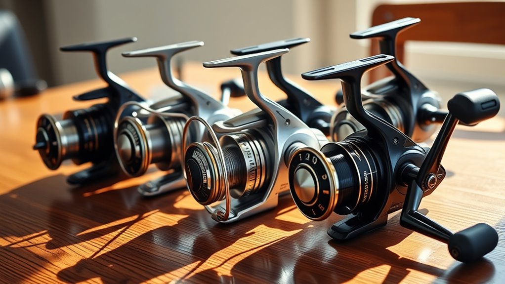 Spool versatility lets you switch braided or mono lines with quick-spool spares. If you want more tips, you’ll discover how these reels fit trophy carp, pike, and big-fish waits.