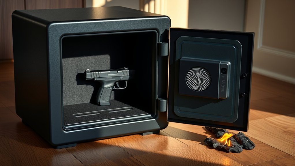 Choosing the right locking mechanism for your fireproof biometric gun safe directly impacts both security and convenience. Biometric locks use fingerprint recognition, giving you quick, keyless access without codes. If you prefer, digital keypad locks let you set personalized 8-digit codes, often supporting multiple users and confirmation buttons.
