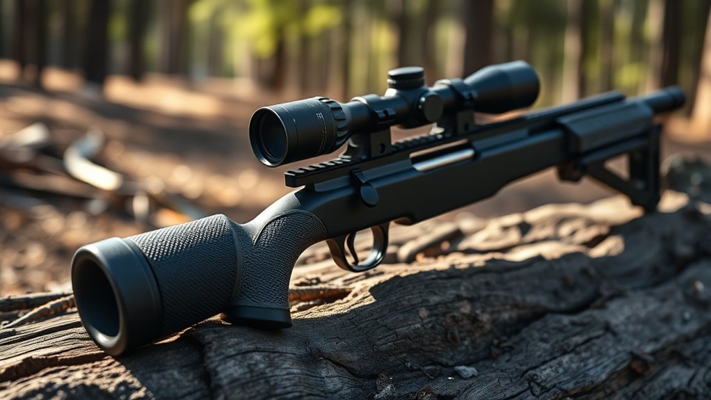 Silent operation matters too, especially if you’re hunting or in tactical situations. You don’t want to spook game or alert targets. Look for durable materials like stainless steel springs or high-quality polymers to guarantee long-lasting reliability.