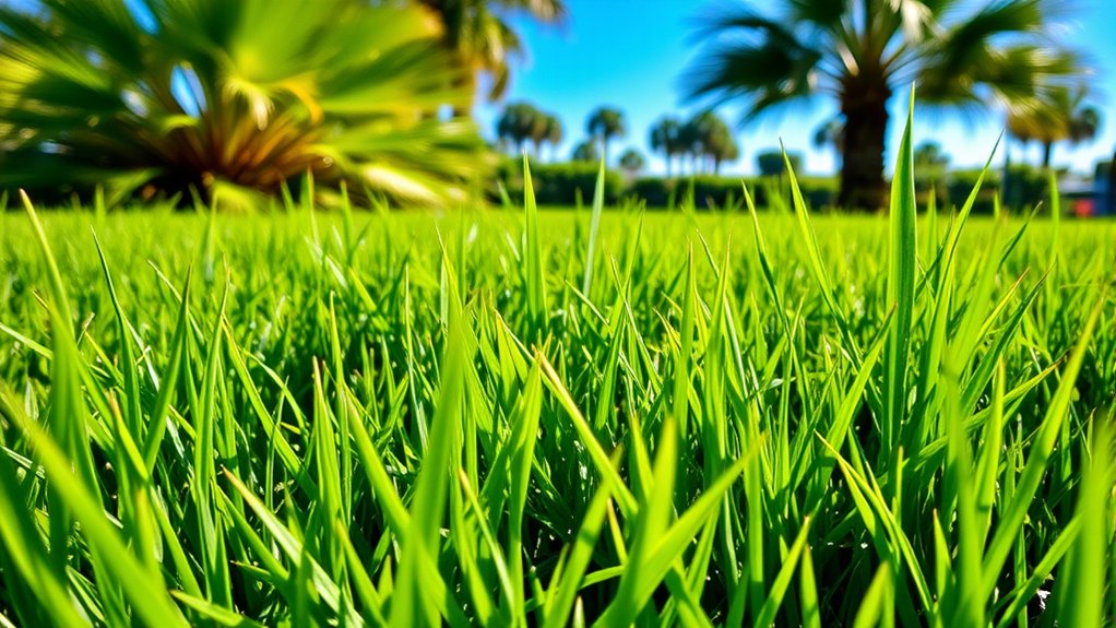 Because Florida’s climate features high heat and humidity, choosing grass seed that thrives in warm, subtropical conditions is crucial for a healthy lawn. You’ll want varieties that handle these temperatures well, especially since Florida’s growing season stretches from late spring through early fall.