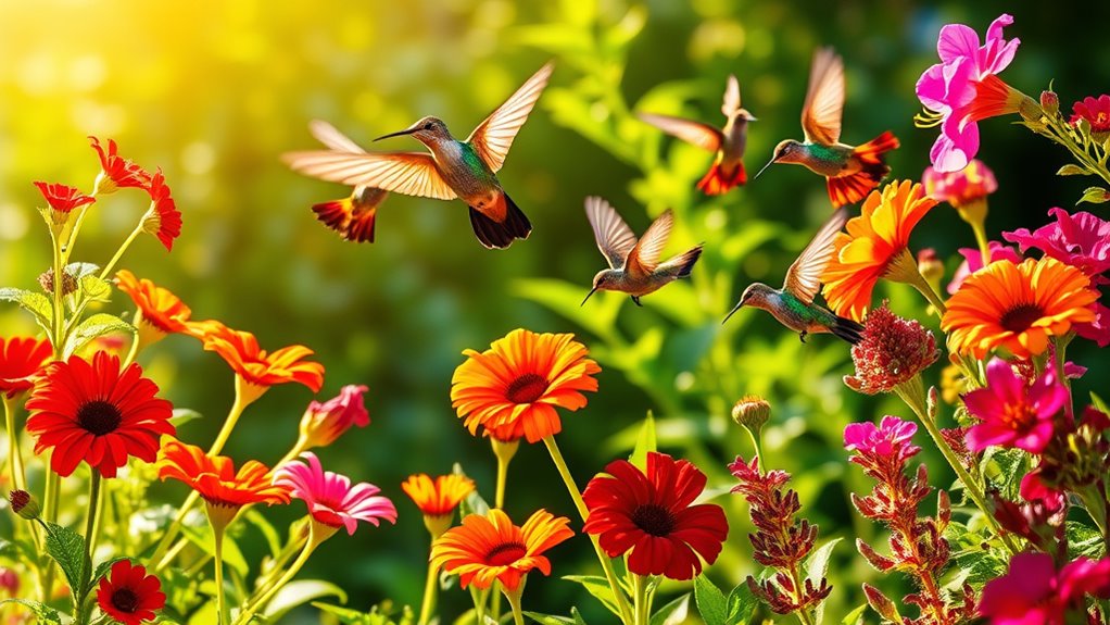 Although hummingbirds are drawn to many flower traits, their preference for vibrant colors plays a key role in attracting them. You’ll notice they’re especially drawn to bright reds, oranges, and pinks, which imitate their natural nectar sources. Red and coral hues often boost hummingbird visitation rates, but don’t overlook purples and yellows—if the nectar’s rich, these colors can attract them too.