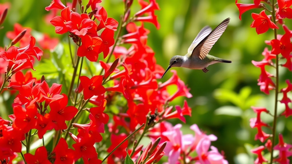 Did you know hummingbirds visit up to 1,000 flowers daily? To attract them, plant companion flowers like bee balm, salvia, and cardinal flower alongside your hummingbird favorites. These blooms offer vibrant colors and nectar, creating a lively, diverse garden.