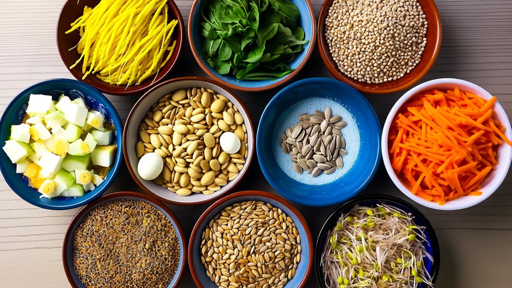 Since vitamin and mineral content directly impacts your canary’s health, you’ll want to prioritize foods rich in essential nutrients like vitamins A, D3, E, and B12. These vitamins boost immunity and support critical metabolic functions, keeping your bird energetic and resilient.