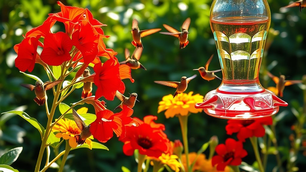 Avoid artificial additives like dyes and preservatives—they can disrupt feeding behavior and harm hummingbirds. Instead, focus on natural nectar that closely resembles flower nectar. This approach supports hummingbirds’ physiological needs and encourages regular visits, helping you enjoy these vibrant birds more often.