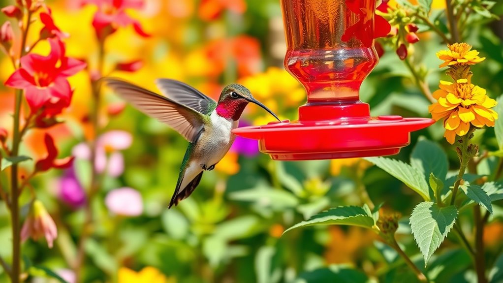 Also, keep your feeders clean and replenish nectar regularly to stop mold, bacteria, and fungus from growing, which could threaten hummingbird health. By providing pure, balanced nectar and maintaining clean feeders, you create a safe environment that supports hummingbirds’ natural feeding habits and overall well-being.