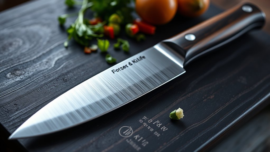 Because the blade material directly impacts a forged chef knife’s performance, you should prioritize quality steel when making your choice. High-quality forged knives typically feature premium stainless steel or high-carbon steel, both offering excellent durability and edge retention. The blade’s alloy composition influences corrosion resistance and sharpening ease, so opt for materials with balanced properties.