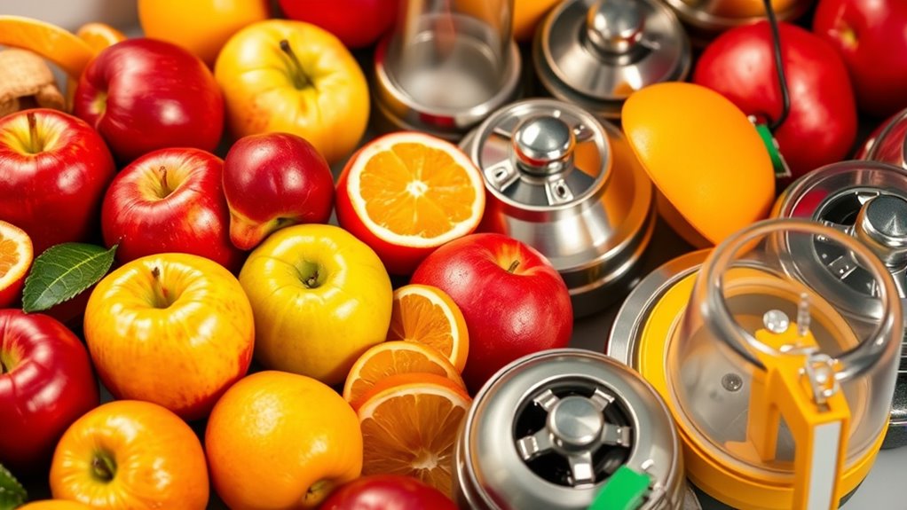 Choosing a fruit feeder that’s safe starts with material integrity: look for BPA-free, food-grade silicone or other non-toxic options that won’t leach chemicals into your baby’s food. You’ll want feeders that display certifications or safety standards, such as ASTM, FDA approval, or BPA-free labels, to guarantee material safety. Avoid feeders with small, removable parts that could pose choking hazards or be hard to thoroughly clean and sanitize.