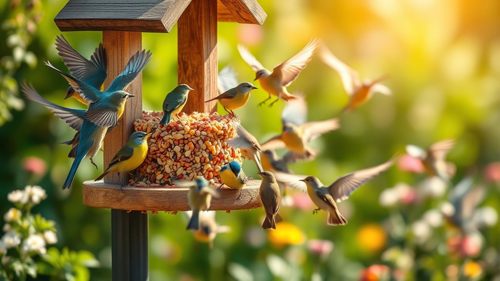 Different seed varieties attract different bird species, so choose a mix that includes sunflower, millet, safflower, or peanuts to diversify your visitors. You’ll boost appeal by selecting black oil sunflower seeds, which are high in fat and easy for many species to eat.