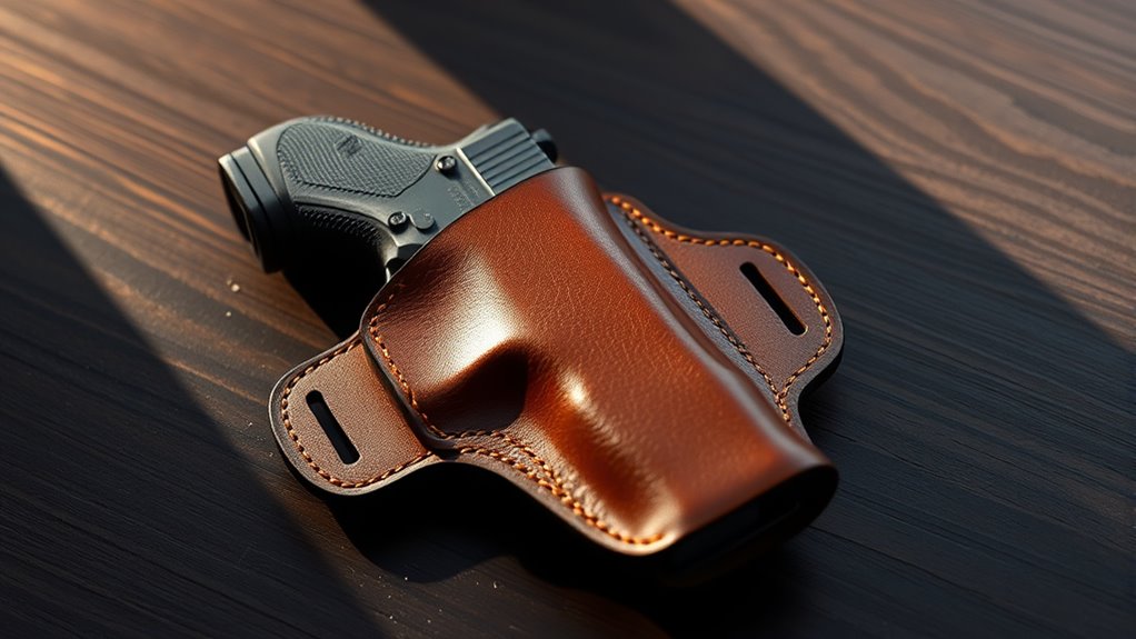 The thickness of the leather matters too—thicker materials provide better protection and last longer but still need to balance comfort. A well-crafted leather holster naturally molds to your firearm, offering secure retention without sacrificing quick access.