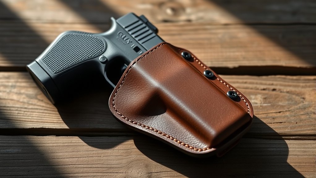 Rounded, hand-finished edges reduce chafing, so your skin stays irritation-free. Finally, choose lightweight, durable materials such as Kydex or premium leather. They offer a secure fit without adding bulk, making your holster comfortable and practical for daily carry.